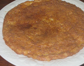 5.锅中放油烧温热,鸡蛋液下锅,用铲子摊成薄饼形,用一圆碗扣上,移至小火慢烘,约4分钟左右,把碗揭开,鸡蛋翻面,用碗再扣上,再烘4分钟左右,切块即可。