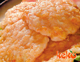 6.滗出余油,虾盛在盘里,用勺在虾饼上按成金钱花纹,带花椒盐上桌即成。