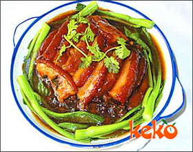 苦菜扣肉:'1.白糖加水适量溶化成糖水;2.将嫩苦菜摘洗干净,入沸水锅中焯一下;3.捞出用凉水冷却后沥水,平铺于盘底待用;4.将五花肉刮洗干净,切成10厘米见方的...