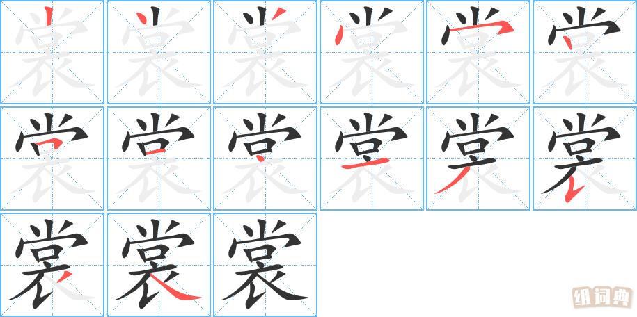 裳的总笔画 14 笔,笔画顺序:1.丨(竖) 2.丶(点) 3.ノ(撇) 4.丶(点) 5.乛(横撇/横钩) 6.丨(竖) 7.𠃍(横折) 8.一(横 ) 9.丶(点) 10.一(横) 11.ノ(撇) 12.𠄌(竖提) 13.ノ(撇) 14.㇏(捺)。