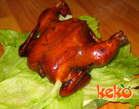 3.把葱段、姜片撒放在鸡身上,再倒入清汤350毫升、酱油、葱油,撒上味精、粗盐放入烤炉内烤10 分钟左右;