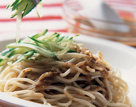 四川凉面:'1.将面条煮熟,捞在干净板上散开;2.面条淋上少许香油,用筷子将面条抖散放凉,分装5个碗内;3.黄瓜洗净切丝;4.蒜头去皮,剁成蒜泥;5.葱切末;6.芝...