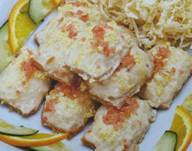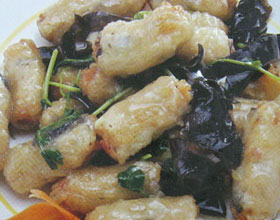 炸熘肉卷:'1.将猪五花肉、荸荠分别剁碎,鲜笋焯熟后与火腿切成粒,同放碗内,加入葱姜末、精盐、料酒、胡椒粉、香油制成肉馅;将精盐、料酒、胡椒粉、味精、高汤...    详细介绍