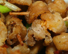 脆炸大肠:'1.将猪大肠用盐或明矾擦洗干净,除去粘液污物;2.将大肠光滑面翻在外面,先用开水焯过,再洗干净;3.然后用清水煮至软烂,捞出,控去水分;4.炒锅用旺...