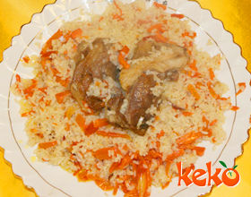 4.将黄萝卜和米饭翻倒均匀即成。盛饭时将拣出的熟肉置饭面上。