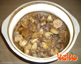 6.锅里放大油50 克,置旺火上,烧至六成热时,下冬笋块炸上色,捞起,投入肉锅拌合再烧,到八成烂时加味精即可。