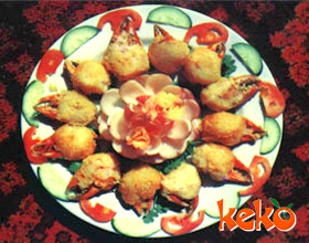 脆炸蟹钳:'1.将蟹宰杀取鳌,用沸水氽约10 分钟至刚熟;2.取其前节,用刀轻拍螫壳,拆出肉;3.留螫壳末端壳及鳌内扇骨;4.虾仁斩剁成茸,加入蛋清、料酒、盐,顺...    详细介绍