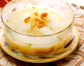 3.炒锅上旺火,加入200克鲜汤,烧沸后放入冬瓜片、海米、精盐煮约10分钟,加入葱花、生姜丝、撇去浮沫,淋上香油即可。