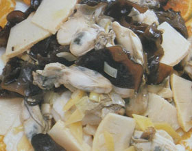 2.炒锅注油烧热,下葱花、姜片爆锅,投入蛎黄肉、木耳、笋片、翻炒几下,加入料酒、酱油、盐及适量鲜汤稍加翻炒,淋上熟油,装盘即成。