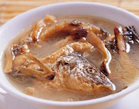 3.锅中油热,鲤鱼入锅中微炸捞起,放入炖锅中,加入药材及汤汁,三片姜、盐、酒少许,炖15分钟即可上桌。