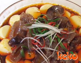 海参豆花:'1.热豆腐盛入大汤盘内;海参切1厘米见方的丁;水发金针菇切小段。2.勺中加油烧热,加葱姜蒜末烹香,加牛肉末炒散,炒透,加料酒、酱油、白糖、盐、味...