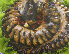 豉汁蟠龙鳗:'1.将河鳗用盐搓洗干净,每隔2厘米在鱼背上切1刀(脊骨断肚皮连),从刀口处取出内脏,洗净待用。2.将豆豉洗净剁烂,红辣椒,葱,姜,蒜切成粒,加老抽,...    详细介绍
